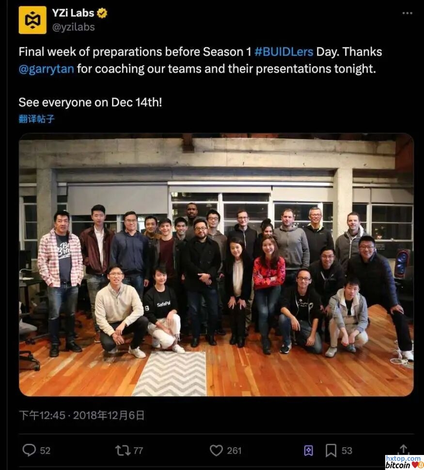光看照片,可能你会觉得这就是一张 YZi Labs( 原 Binance Lab)在 18 年放出的普通合照,内容大概是当时邀请了知名创投孵化器 Y Combinator 的老大 Garry Tan,为 BUIDLers 孵化计划的新项目创始人们进行授课指导。 图中 C 位黑色衣服的正是 Garry,但重点在他的背后: 这位戴眼镜、穿着浅色毛衣、表情略显青涩的小伙,看起来非常像现在 Hyperliquid 的创始人 Jeff Yan。如果把这个照片再放大一点,再和 Jeff 公开的近照相对比,从特征上来说确实高度相似。