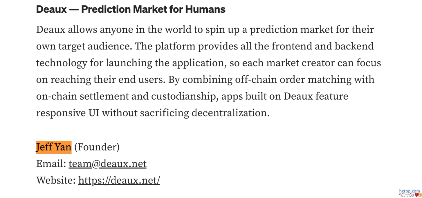 考虑到 Hyperliquid 目前在 Perp DEX 领域的地位,日交易量动辄数十亿美元,在某种程度上已成为 Binance 合约业务的直接竞争者,那么这张照片的意义就不只是「考古」这么简单了。 评论区很快炸开了。 许多人 @ 了 Jeff 的账号 chameleon_jeff 想问到底是否是同一个人,也有一部分声音指出 Binance 可能无意间培养了一个竞争对手。 无论如何,如果照片属实,那么一个技术型创始人,在 7 年间完成从孵化营学习者到巨头挑战者的蜕变,本身就是一个值得拆解的样本。 上面那张照片里对 Jeff 的考古,其实并不是空穴来风;更有力的佐证来自 Binance Labs 的官方记录。 在他们发布的 Medium 文章中,2019 年 Season 1 孵化项目名单里出现了一个名为 Deaux 的项目,创始人正是 Jeff Yan。 Deaux 是什么?简单来说,它是一个去中心化的预测市场平台。 从当时的描述来看,Deaux 想做的是: 让任何人都能在链上创建预测事件,用户可以对这些事件下注,价格由市场供需决定。它采用混合架构,订单匹配在链下完成,最终结算在链上执行。 这种设计在 2018 年已经相当超前,既要性能,又要去中心化,为预测市场提供一个加密基础设施。