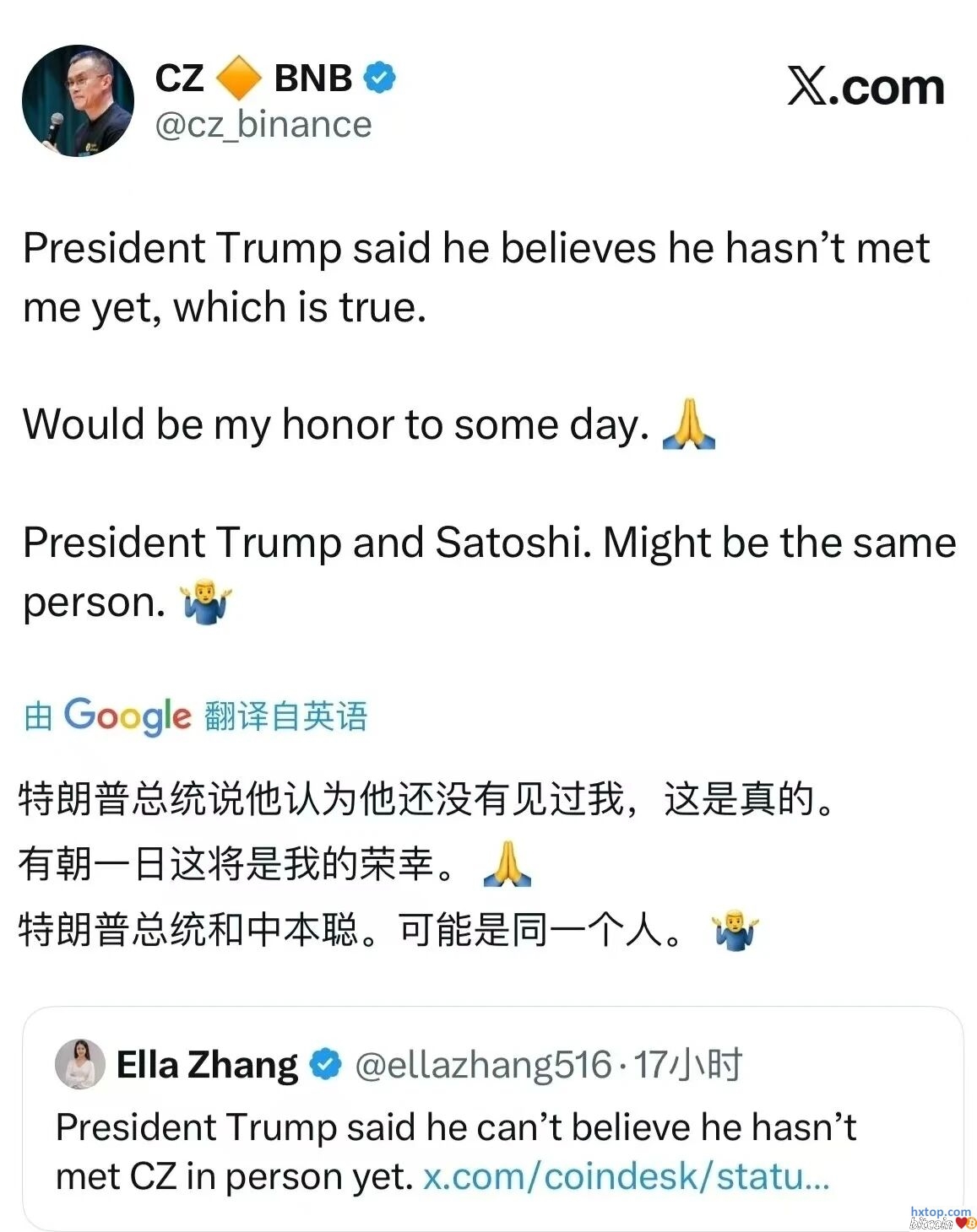 在特朗普于10月23日签署对全球最大交易所币安创始人赵长鹏(CZ)的总统特赦后数小时,赵长鹏发文: 特朗普和中本聪可能是一个人!