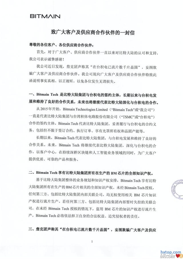 针对“抢”矿机一事,詹克团方面发出了回复,称“抢”的矿机产权是北京比特的子公司福建湛华所有,而吴忌寒将产权转移给了新加坡比特的子公司重庆硅原所有,但这些公司都是开曼比特的子公司。所以一团乱账,各说各有理。 吴忌寒方面发出的另一封信,信息量比较大,它提到了詹克团能否做出矿机的核心:台积电。这家万亿市值的巨兽,或将成为比特大陆内斗的关键因素。 文章透露出几个重要信息: 1:詹克团对客户说已经在“台积电流片数千片晶圆”。(吴忌寒方面指这是欺骗客户,据悉确实与实际情况有较大出入,不管是数量还是时间) 2:吴忌寒控制香港比特一直是比特大陆集团与台积电的签约主体。 3:香港比特享有比特大陆集团所有在生产的BM芯片(比特币)相关的全部知识产权。 4:北京比特下单极少数测试晶圆,也要得到香港比特的同意。 目前双方各不相让,在开曼漫长的官司结束之前,很有可能出现两个“比特大陆”和“蚂蚁矿机”。吴忌寒方面没有供应链,詹克团方面没有芯片,但都在补足这一环节,去造出能够赚钱的矿机。 这封信透露出吴忌寒掌握的香港比特,是台积电的签约主体,因此吴忌寒方面有充足的芯片,由于矿机除了芯片以外都比较简单,重建供应链速度较快,据悉本月就可以发货。 詹克团方面难题在于,虽然掌握深圳工厂,但也需要重新流片,时间很长。而台积电一定还需要支付预付款,需要庞大的资金。这也是詹克团最近不惜冒着违法风险“抢”矿机甩卖的原因。 比特大陆的成功,至少有一半的功劳要归功于台积电。台积电的工艺比三星优秀,这也是比特大陆S19能相对于神马、嘉楠的三星8nm机器性能更好的核心原因。当然台积电也因为比特大陆赚取了大把钞票,曾经台积电大陆的女销售被称为“比特币女王”。 至于双方和台积电的关系,据说最早是吴忌寒带队去和台积电谈判;但后续又是詹克团负责相关沟通,每几个月都亲自赴台打点。有可能双方都和台积电有比较密切的关系。而台积电方面,由于华为产能释放,目前产能相对比较充足。 总之,台积电是绝对的强势方,它的目标只有一个,就是比特大陆更多出货,持续买它的芯片。目前台积电对此还没有回应,它会支持哪一方?会否给詹克团大量的芯片供应?目前尚不得而知,但将成为天平偏向哪一侧的决定因素,相信双方都在不遗余力地努力。 詹克团方面回应: