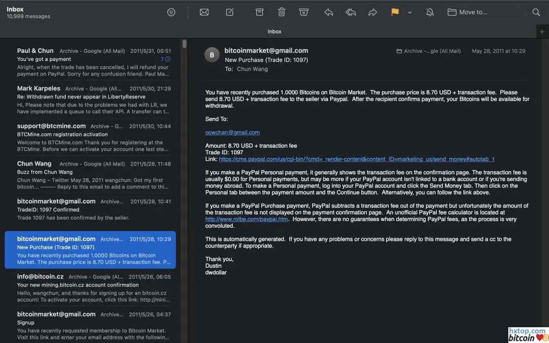 2011 年 5 月 28 日,单价 8.7 美元(折合),王纯买下了人生中第一枚比特币。