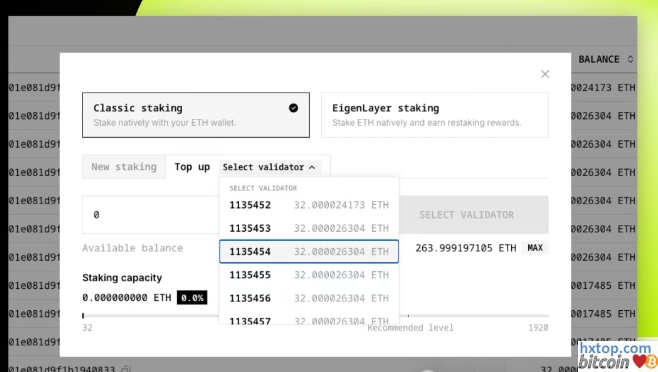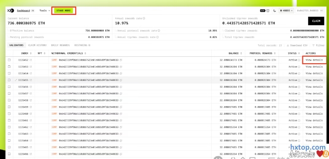 4)点击“TOP UP VALIDATOR”(充值节点),并从您的钱包中批准交易,等待交易被以太坊网络确认后,您的充值金额会被添加到对应的Validator中。 5)您也可以直接在Dashboard中,直接点击“STAKE MORE”,进入质押模式,在“Classic staking”选项卡中,选择“Top up”,对目标Validator充值。