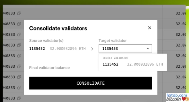 2) 从已选择的Validator中,选择一个作为“Target validator”(目标节点)。选定后,点击“CONSOLIDATE”,并从您的钱包中批准交易。