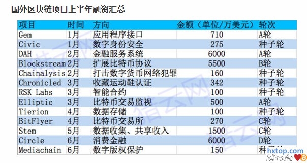 国内区块链概念项目融资更多集中在早期;投资方并没有出现大型VC的身影,中小型投资机构居多,还有一部分是希望通过区块链技术改进原有技术的公司,可以看出目前国内的大型VC对该技术发展还是持偏谨慎态度;此外,产品处于研发、测试的居多,并没有真正意义上被大范围推广的产品。 国外区块链项目上半年融资汇总