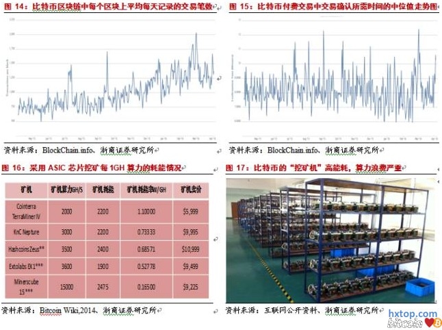 5. 比特币区块链的三大缺陷比特币是目前最大的区块链,但是具有区块容量限制、交易确认时间长、能量消耗大等缺点,成为限制其在其他领域进行大规模商业化应用的不利条件。1)区块容量限制:中本聪设计比特币区块链时,人为设置了每个区块1MB 的大小限制。随着比特币发行量的增多和应用的推广,目前比特币网络已经接近了这个上限,交易时间延长,甚至在高峰时一些交易请求无法成功。对于是否应该提高区块容量上限的问题,比特币社区内部也存在巨大的分歧;2)交易确认时间长:比特币的区块链中每个新区块的生成平均需要10 分钟。再加上区块大小的限制(每块最多可以容纳4,096 笔交易),比特币网络每秒只能处理7笔交易,远远低于Visa和Master 网络每秒上万笔交易的能力;3)能耗高,算力浪费严重:比特币矿工目前的“挖矿”设备已经由300MH/S的CPU 升级到了5TH/S的ASICs。据估计,目前比特币网络处理一笔交易的耗电量相当于美国一个家庭一天的耗电量,对应的碳排放有534 吨/日或825 万吨/年。