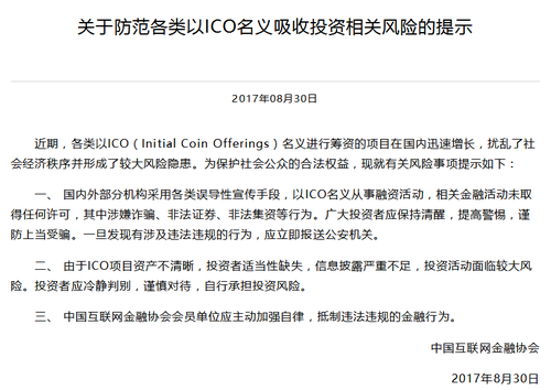 8月30日,互联网金融协会发出《关于防范各类以ICO名义吸收投资相关风险的提示》,指出“扰乱了社会经济秩序并形成了较大风险隐患。”