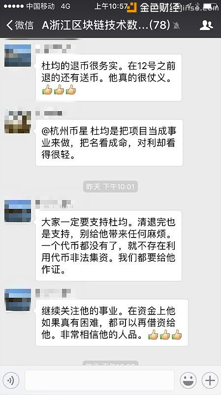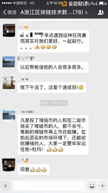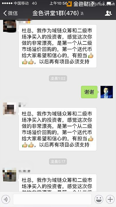 估计过年都没听到这么多称赞的老杜,面对这么多称赞虽然一脸坦然的接受了投资人的赞叹,想必内心早已激动难耐了,想要说点什么估计也是得删删减减改了好几遍,最后无奈只能回一句谢谢。 投资人得到真正的实惠了,老杜也得到了投资人的认可了,域链团队认真靠谱的态度被众人所了解了,一切都是那么的圆满,至于老杜会不会因为此次大放血晚上躲在被窝里默默的埋怨自己人傻钱多,那笔者就不知道了。 原文转自巴比特论坛,原文链接为:http://8btc.com/thread-73294-1-1.html |