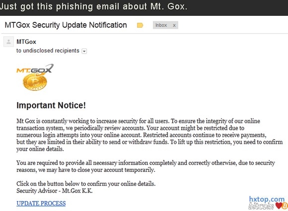 如果收到了相当明显的网络钓鱼电子邮件请不要点击任何链接(不要有任何好奇),不要提交任何网站上的信息,这个电子邮件中的链接,请记住在地址栏上显示的不会是MtGox.com而是类似于mtg0x.com的域名,请不要输入您的密码更不能提交您的任何信息或者改变你的MtGox密码!