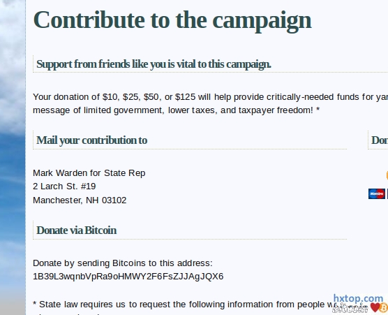 2012年8月11日在美国的新罕布什尔州--国家代表马克·监狱长最近增加了Bitcoin捐赠系统,他的竞选网站(http://www.markwarden.com/page/contribute-campaign),在新罕布什尔州的第一个国家代表利用这一新兴技术。据监狱长介绍Bitcoin将允许网上交易,而不需要任何第三方的批准。这是一个尖端技术,是基于自愿的原则,极具创新性的市场。监狱长说“我喜欢这种交换媒介的成分和供应商,因此很自然要回应市场“