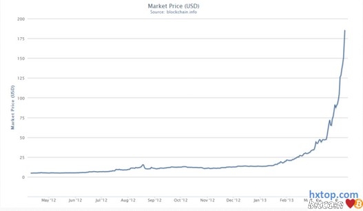 一枚比特币在今年二月份的时候价值大约 25 美元,而今天它的价值是 185 美元。诺贝尔经济学奖获得者 Paul Krugman 在 2011 年为纽约时报写了一篇关于比特币的专栏,名为《金色的数字锁链》。Krugman 并不看好比特币,认为比特币与金本位制的货币制度存在同样的问题:当货币供应量是固定的,这个货币的经济将会出现囤钱现象和通货紧缩。 2011 vs. 2013 在 2011 年的时候,一枚比特币大约兑换 2 美元,而且当时比特币的概念还是非常小众的,主要是数字朋克(Cyberpunk)和有无政府主义倾向的人群在关注,因为比特币是一种无国家货币,它不用纳税、更无法冻结。我第一次接触到比特币是在浏览 Craigslist 的时候,有一个人在卖一台很明显是偷来的 15 英寸 Retina Macbook Pro,要价 50 枚比特币;比特币是一种不用洗的钱。 但是现在是 2013 年了,比特币的整体生态系统相比 2011 年有了大幅度的改进。在最近几个月,比特币已经成为了一个热门话题。首先,比特币的市场价值在最近几个月呈直线上升趋势: