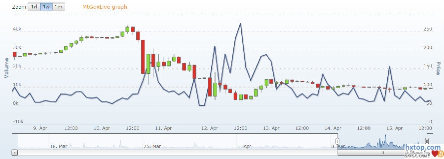 由于近期比特币过山车一般的行情,引起了业界对于这一虚拟“货币”的强烈关注。在此之前,虎嗅网上的第一篇相关文章是“比特币本月上涨152%,将成为全球经济最后的避险天堂? ”这篇文章发表于3月29日。10天过后,比特币狂跌,于是又有了这篇文章“暴涨后瞬间猛跌60%,比特币会成为另一场郁金香狂热吗? ”该文章描述的猛跌60%其实发生于4月10日,而4月10日之后,比特币的下跌势头并没有停止,在4月12日和13日均曾创下较大跌幅。4月14日之后,则陷入量价齐跌的低迷状态。从Mt.Gox的交易行情图上可以清晰的看出比特币最近7天的价格走势。 不到一个月的时间,比特币从高峰呼啸坠落;同样不到一个月的时间,业界由交口称赞到悲观失望,充分反映了比特币目前所处的投机状态,以及人们对于一枚比特币的正反两面认识仍然不足。