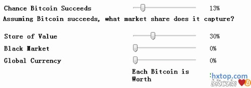 举例来说,如果我假定长期来看比特币成功的比率只有10%,那么比特币的总是从价值将达到目前黄金市场的30%,每个比特币的价值将达到13500美元。比特币现值为129美元,那么这将是一个很好的投资(当然也存在风险)。 如果你输入你的参数假设值,你得到的结果是多少?如果比现值大的话,那么你应该买一些做投资。 |