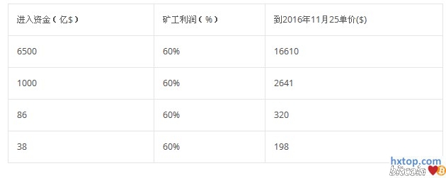 网上也有一种说法,认为比特币的价值完全来自于人们对它的信心,信心的涨幅决定价格的高低。其实这是将比特币当做了一种新型纸币,因为只有纸币才是需要政府暴力或担保为其做背书的,但是比特币显然现在不具备这种背书,在这种情况下,为什么比特币能炒出二百多美元的价格,而冥币却不行呢?有人说那是因为冥币可以无成本的滥印,而比特币有总量限制,可问题是比特币的种类没有限制啊,它的山寨币兄弟们可以无限制的复制,为什么没能让比特币价格归零? 有人会说它的价格不是一步到位的,是在四年多的时间里慢慢升值,这有点说到点子上了,但描述的只是现象,透过这个逐步升值现象背后的本质是什么?到底为什么比特币价格有起有落却逐步向上?它有没有可能一夜归零?未来它的价格倒底会有多高?本文试着做一个阐述。 我们先想像着把BTC的整个市场看做一个游泳池,则目前是这个池子有1100万平米(总币数),池水深144米(美元单价),所以池水总容量是16亿立方米(总市值)。这个池已经很大,从短期来看,微风吹来碧波荡漾,水面总是有起有伏;但有点生活常识的就知道,这个变化不会很大,我们要看未来这个池水水位的升降,归根到底是要研究这个池子的进水和出水。 那么这个池子有哪几个进水口和几个出水口呢?细分如下: 进一:矿工投入;出一:矿工收益。 当一个人想投资BTC时,他可以有两个选择,要么直接买BTC,期待后期升值;要么买矿机,用电和时间获得BTC,并抛售后兑现。两者各有利弊,我不展开讲了,但从这里我们就可以明白,这个池子中有一部分水就来自于矿工们的设备投入和电费支出,这是对BTC世界的投资。 但矿工投资是要回报的,因为运营有成本还冒着价格变动的风险,所以一般来说会很快变现。变现收益要求比投入大,两者之间的差额就是利润,从历史上看利润为负值只在去年底产量减半的短期内出现过,因为如果亏损矿工自然会减少计算力的投入,不然亏损的事没法长期做。 结论:矿工投入<矿工收益,差额后文详谈 进二:交易兑入;出二:交易兑出。 为现实交易而进行的汇兑,无论是买毒品还是羊毛袜子。由于BTC还不是通用货币,现在的交易只能是法币兑入使用后再兑出,由于是为实际支付进行的,为避免汇率损失间隔时间一定不长,因此可以认为两者几乎是相等的 结论:交易兑入≈交易兑出 进三:投机进入;出三:投机离场。 是指投机客利用BTC与法币以及不同法币之间的汇率波动进行投机赚取差价的行为,俗称“搬砖”。由于BTC现在不能卖空,所以要想获利只能低买高卖。投机者增强了市场的活跃度,并使得各个不同的交易市场中的价格趋同(目前主要是向MTGOX靠拢)。虽然投机者的目的是赚钱,但事实上除非永远离开市场,否则资金同样会很快回到这个池子,这一点很象赌场,赢钱的不肯走、亏钱的想翻本。以目前的情形,一笔钱离开BTC世界并且终身不再回来的资金应该很少 结论:投机进入≈投机离场“ 进四:交易费用;出四:交易税 交易费用是指BTC在网上支付时,被程序扣走用于奖励矿工的那部分钱,未来在挖矿不再给奖励时,这个费用将成为矿工的主要来源。以交易量为基础计算,通常是万分之一数量级; 交易税是指法币进出交易所及兑换成BTC被扣走用于支付交易所费用的那部分钱,以出入金数量计算,通常是千分之一数量级。考虑到交易量会大于出入金数量,且这两笔钱总额都很小,所以认为近似相等。 结论:交易费≈交易税 进五:收藏资金与丢失币 指那些看好未来BTC的升值潜力而长期放在其中不取走的钱(比方说老端的基金,还有叫Rickard Falkvinge的那个瑞典人),在投机资金中那些长期运作的资金实际上也属于这一部分,还有一些矿工挖了币长期不卖的,相当于同时也在扮演收藏者的角色。事实上这笔钱很重要,而且历史上的几次起伏都源自于这笔钱对BTC的信心变化,因此使人误以为BTC是信用币了。 出五: 没有对应的出水管,但要强调已知未来四年里这个游泳池会稳定的按130万/年左右的速度扩建(增发币数),相当于今年要扩建12.2% 综上所述,我们可以明白,去掉那些细枝末节,研究比特币价格,最终就是要研究“当前单价”与“(收藏资金-矿工利润)/市场扩容”之间的比值,这决定了未来不断增发过程中价格是往上走还是往下走。简单的说,即未来价格=(当前市值+收藏资金*(1-矿工利润率))/市场总量。这里面当前市值和市场总量两值是已知的,最难的就是对“收藏资金”和“矿工利润”这两点的分析了。 首先分析“收藏资金(含丢失货币)”倒底有多少?这还真的很难确定,但我们可以有几种方式进行一个合理的估计: 一、常有人觉得BTC是传销,我说肯定不是,但还真有个传销产品可以进行分析和研究,它叫SMI,具体模式限于篇幅我就不写了,但这个传销在2007年05月28号发行价值12.5万“游戏币”经过这几年的增值,市值已经升值2000多倍!考虑到SMI吸引的都是社会低端人士且未得到社会广泛认可,而且交易效率(相当于我们的矿工利润)低下只有50%左右的情况下,以良好的赚钱效应吸引了至少十亿美元进场。 二、还有人说BTC更象收藏品。那我们就看看邮市中的“龙头老大”庚申猴票的成长,它总发行量500万枚,一说实际上市的只有340万枚,发行时只有八分钱,在三十年时间达成至少450亿人民币市值,折算约72亿美元市值。 三、BTC是个国际性的产品,所以我们找一个国际性的