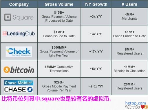 Square、LendingClub、比特币等颠覆性的金融服务年增长率均在 2、3 倍以上,市场规模在几十甚至几百亿美元