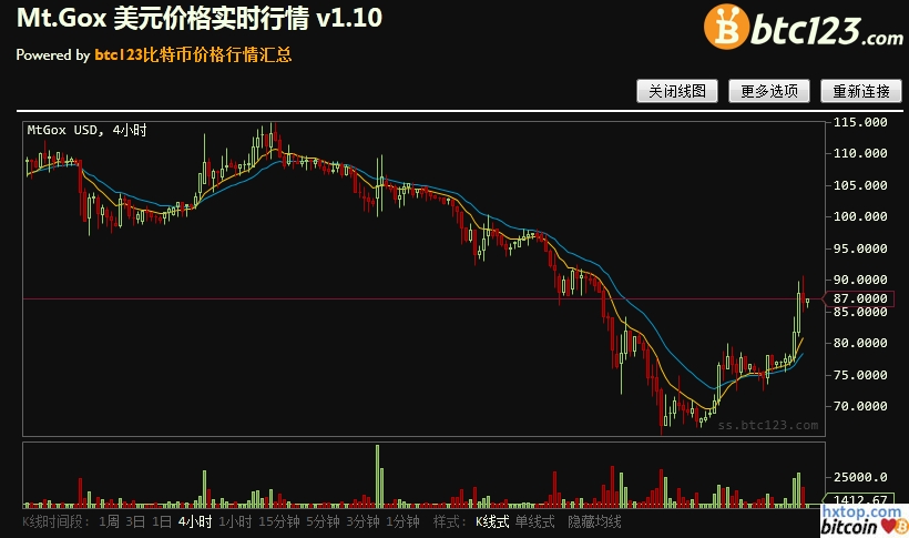 比特人消息 周四国际比特币一路走高至90.7美元,涨幅一度逾17.74%。目前小幅回落交投于87美元附近。凌晨美联储公布的6月会议记录显示,决策者希望看到失业率下降之后再放慢购债计划。 (责任编辑:nightcat) |