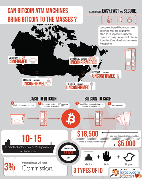 拉斯维加斯 RoboCoin公司生产的比特币ATM机已经抵达加拿大临近太平洋的温哥华市,其余四台机器将很快部署在加拿大最大的城市多伦多、 蒙特利尔、卡尔加里和首都渥太华。下图是这五个城市的区位图,从左到右分别是:温哥华、卡尔加里、 多伦多、渥太华、 蒙特利尔。