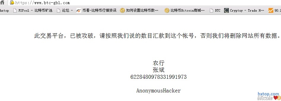 BtcMini深夜发来最新报道:著名港盘GBL今日凌晨2点左右被黑,首页显示黑客敲诈信息。但网友反映网站被黑疑似自导自演。所有网站管理高层均已失踪三天。网站近日也出现多种异常行为,目前官方Q群3点起开始踢人。一旦GBL跑路,将会造成数千玩家的数百万人民币经济损失。并且将成为国内第一起大规模虚拟货币诈骗案。大量网友已经报警。 笔者访问此网站https://www.btc-gbl.com/时出现如图所示: