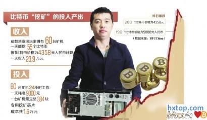 《比特币一天暴涨74%中国大妈现身炒币》追踪 @华西都市报:比特币的暴涨暴跌还在继续。在18日暴涨74%之后,昨日比特币出现大跌行情,从19日5888元的高位直线跌落到4358元,跌幅高达25.9%。拥有60台“挖矿机”的成都资深玩家龙禹江告诉记者,昨日的暴跌是由于前期囤积了大量比特币的挖矿团趁高位出货造成的。 比特币的疯狂还在继续上演。昨天,成都白领张兰逛淘宝,发现一台像电脑主机的东西,开价58万元,而她刚在三环边上买的一套70平方米的房子,也就60万元。 张兰看到的是一台比特币挖矿机。昨日华西都市报记者找到了这位淘宝卖家,他的另一个身份是四川菲尔航空CEO龙禹江,曾通过了天府软件园“2012年创业场首次项目评审会”,主要从事虚拟仿真飞行业务。 2009年7月就开挖比特币的龙禹江,是中国最早一批比特币淘金者。龙禹江昨日告诉记者,他拥有60台挖矿机,托管在一个机房里,光一天耗电就达9000元,产出也相当惊人,按最近的行情,一个月挖的比特币能换好几百万人民币。龙禹江向记者道出了比特币玩家这个圈子里的种种,揭开了比特币神秘面纱。名词解释 比特币诞生于2008年,是一种由开源的P2P软件产生的虚拟货币。基于一套密码编码、通过复杂算法产生,任何人都可以下载并运行比特币客户端而参与制造比特币,利用电子签名的方式来实现流通。它的主要特点包括:去中心化、全球流通、具有专属所有权。 比特币总量只有2100万个。比特币存在于数字空间中,隐藏在特定算法里,需要投入大量人力物力才能挖出来,这就是所谓的比特币“挖矿”。而挖矿机运算能力的最基本单位是MB,运算速度1MH/s,意思就是每秒运算1兆赫兹。1T=1024G,1G=1024M。 矿团高位抛售比特币昨日暴跌两成 “昨天(19日)都是24、50、100个比特币地抛盘,这两天肯定要跌。”龙禹江话音刚落,中国最大比特币交易平台BTCChina的交易价格就从19日均价5888元的高位,直线跌落到了昨日下午的4358元,跌幅高达25.9%。 “好多7000+买的,一地都是血啊”,“亏惨了,心脏受不了”,“太容易被操控了,有钱人耍的”……昨日某比特币玩家QQ群里一片哀嚎。 “现在全球平均每小时开采160个比特币。”据龙禹江介绍,总量2100万个的比特币,截至目前已挖出了1196万个。前期囤积了大量比特币的挖矿团,趁着这几天的行情疯狂出货,下跌是必然的。 拥有60台矿机成都玩家开卖矿机 龙禹江告诉记者,他拥有60台挖矿机,总计算能力为300TH/S,这些年来平均每天挖矿量为69.2175个比特币,目前一天能挖到55个比特币,按价格4358元人民币计算,一天他能收入23.9万。 不过,投入也非常大。他透露,这些矿机24小时工作,一天耗电就达9000元,一台620GH/S计算能力的矿机,需要安装43元一片的专用挖矿芯片384块,光芯片成本就要1.6万多,而这些饱和工作的矿机,芯片损耗率也相当大。 更严峻的情况是,比特币越来越难挖。龙禹江预测,3年后每天只能开采25个比特币,30年后一天能挖到一个就不错了。 “挖矿还有三四年的行情吧,所以我现在一边挖,一边卖矿机。”龙禹江告诉记者,他昨天首次对外售卖矿机,58万那台是最高档的,计算能力2TH/S,“下单后半个月内送货上门,一个月能挖到50个比特币,几个月就能回本”。他透露,已有不少人询问情况,主要是一些传统行业的投资客,嗅到商机,也想来插一脚。 揭秘中国比特币“四大天王” 从龙禹江口中,华西都市报记者了解到中国有四大比特币顶级玩家,一个比一个神秘。 “第一个叫李笑,中国比特币首富,持有量价值6亿人民币”,他告诉记者,李笑是前新东方教师,主要是投资和组织研发“挖矿机”,曾经因为挖矿用电量太大被断电。 据报道,今年5月,李笑在深圳、广州、上海等地路演,募集国内首个比特币基金。该募资计划显示,基金总额为2000万元,采用有限合伙的形式募集。个人投资者最低出资额为10万元。 第二个是人人网联合创始人杨曜睿,其组建了ASICME团队,专注矿机销售,按照ASICME团队公布的矿机参数,一台售价3000元的最低配置挖矿机,按照现在的比特币挖矿速度,30多天便可以回本。从2013年6月2日上线到6月底,其销售出去的矿机总价已达数百万元。 第三个很神秘,至今无人知道其真名,只知绰号“南瓜张”,但其工作在中国比特币产业链上至关重要,因为他提供矿机专属芯片“阿瓦隆”,杨曜睿矿机装备的芯片就是“阿瓦隆”。 龙禹江告诉记者,目前全球有四大矿机芯片生产商,三家都在国外,且不对外销售,只提供自己的矿团装备,因此“南瓜张”在中国的地位是独一无二的。 第四个顶级玩家名叫“烤猫”,这不是某个人的绰号,而是一个矿团的名字,它是全世界最大的矿团,挖掘速率一度接近全世界的30%。如今“烤猫”是一个股份制公司,最大股东及创始团队叫做“深证比特泉公司”。这个公司也十分神秘,记者在网上四处都查不到相关介绍。 据了解,“烤猫”于2012年8月在BitcoinForum(比特币官方论坛)上IPO,成立ASICMINER,总共发行40万股,其中公众持有163962股,深证比特泉公司持有236038股,原始股0.01BTC一股,如今市值已经超过一亿美元。 不过,在言谈中,龙禹江对以上4人有些不以为然,他声称,自己主要活跃在国外比特币江湖,人们称他为“Mr·Long”。 尽管只是一种在虚拟空间中用特定算法挖出来的虚拟货币,但比特币为这些玩家们带来了巨额的收益,而围绕着这一货币几乎已经形成了一个完整的产业