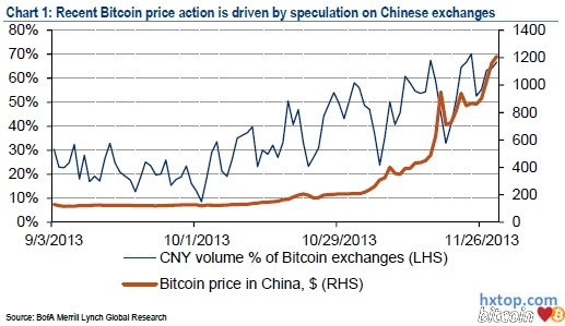 - 优点三:匿名特性。这个便于在资本管制国家进行跨境交易。这个特性你懂的。看一个图就明白了。天朝的交易量现在已经占所有比特币交易量的接近 70%,用于干嘛了,请自行脑补。这个价格图,与在中国的其他品种炒作比较类似,我十分怀疑比特币的价格也是被中国人炒作上去的。
