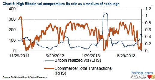 - 缺点三:价格波动率太高,价格太过于波动的话,会大大降低比特币作为支付手段的可靠性。这个与第一个缺点结合起来,更放大了比特币作为交易媒介的不易用。想想,50分钟前,你收了1B,结果50分钟之后,这 1B 跌了10%,或者上午挖到的矿,下午在央行发出消息之后,跌去20%,你愿意把它作为你的主要交换媒介吗?我是不愿意的
