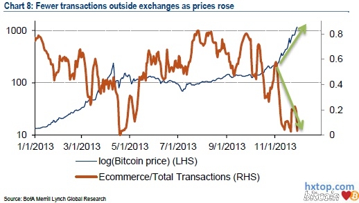 作为价值储藏媒介,我认为是比特币未来可能的一个用途,就是像黄金一样被挖出来然后再挖个坑埋下去。从比特币的交易量来看,也是这个趋势。下图所示的比特币作为货币在交易所外的交易量的下降趋势,说明大家越来越不愿意把手上的比特币花出去,而是存起来,这个一方面是因为比特币有升值预期(这个预期什么时候改变,暂时还不知道),另一方面是,投机资金的大量加入,稀释了比特币交易需求。这也是我对比特币泡沫判断的第二个 anecdotal evidence。