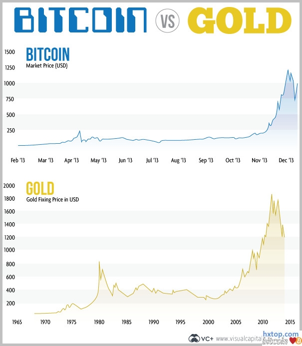 比特币用了9个月的时间画出了黄金在过去40年走过的走势线。 1980年时,由于通胀、亨特兄弟操作银价外加苏联进攻阿富汗以及伊朗革命的爆发,黄金价格曾经涨至850美元/盎司的水平。2013年3月,塞浦路斯银行关闭以及随后的存款征税后,比特币价格开始上涨。 比特币和黄金的价格都会下跌,然后开始大幅上涨。从2000年期,金价在12年中连续上涨。而2013年11月,在伯南克(Ben Bernanke)发言肯定比特币后为比特币价格带来了最显著的上涨,比特币价格甚至一度超过黄金价格。 大涨之后就是回落。金价今年下跌了25%,而今年12月初,比特币价格也有显著下跌。 甚至比特币的黄金的供应量也有相似之处。