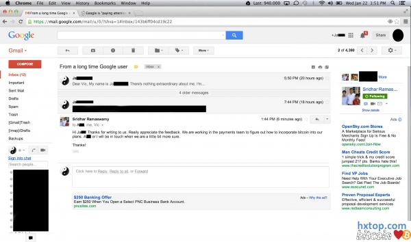 这则消息是由Reddit论坛上的JasonBored发出的,帖子标题为“Google已经确定支付团队正在整合比特币”,并公布了和Google高级社交副总裁Vic Gundotra之间的邮件对话,在信函中告知他公司正在匹配比特币。