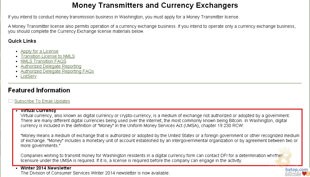| 美国华盛顿州金融管理局网站公布了关于汇款服务和货币兑换服务的新规定,其中根据《统一货币服务法案》的19章内容的定义,将“虚拟货币”认定是一种货币,其中包括“比特币”,经营虚拟货币业务的企业需申请牌照。