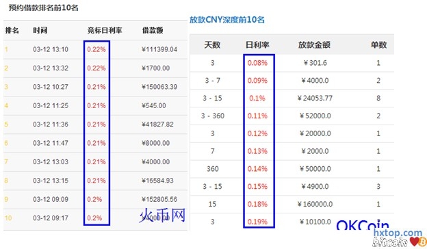 1、融资融币便利性(这点伦家必须使劲吐槽) 火币网的资金池是有上限的,当资金池被借空,用户则无法向平台借款,如果有其他用户还款后才能继续借款;OKCoin的借贷是完全放给市场的,只要利率合适随时可以借到。总体来说OKCoin的融资便利性要略胜一筹。借贷便利性对比火币(左),OKCoin(右)。