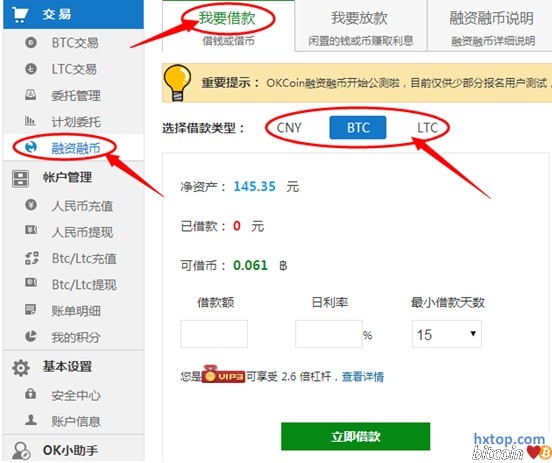 OKCoin的操作:OK将账户分成了两部分,一部分为原来的交易账户,另一部分是放款账户,改放款账户是独立于交易账户的,只能放款赚利息。借款点击“融资融币”→选择“我要借款”→选择借款种类→输入金额、利率、借贷天数,系统按照放款深度撮合借款,若暂时借不到则进入借款深度列表。
