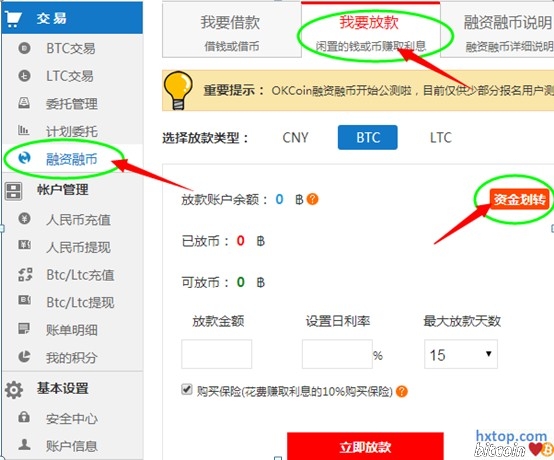 OKCoin的放款操作:用户选择“融资融币”→选择“我要放款”→“资金划转”,将资金(人民币/比特币/莱特币)转到放款账户之后才可以进行放款。选择相应的币种填写放款金额、利率和放款天数就可以放款了,同样是系统撮合放款,暂不能放款成功的将进去放款深度。这里的操作略显复杂,但是没有冗余的操作,总体说得过去。