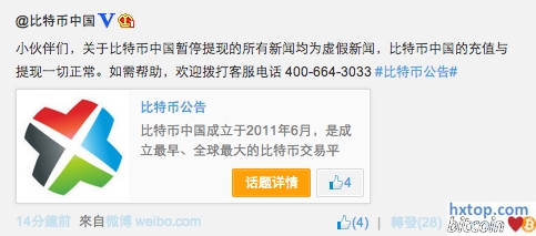 网传比特币中国暂停体现,受此影响比特币下跌5%左右,全球加密货币市场也因传言大跌。 今天9点25分左右,比特币中国发微博称并没有暂停人民币体现,关于比特币中国暂停提现的所有新闻均为虚假新闻,比特币中国的充值与提现一切正常。 |