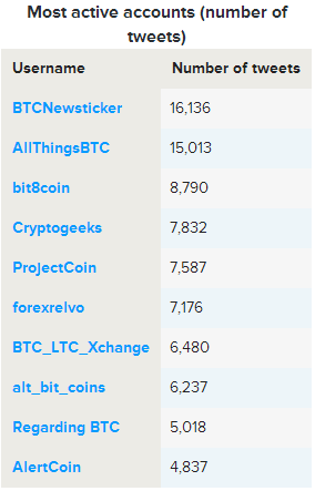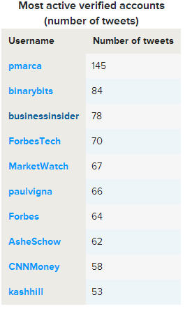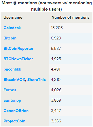 下图是被@次数最多的十个用户。毫无意外的比特币的新闻专家Coindesk占据了榜首。实际上大部分数字还要更高(有些甚至会高出许多),因为推文经常会引用多个推特账户,但是因为数据格式的原因,我们很难计算那些推文。