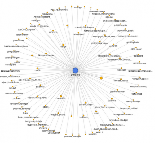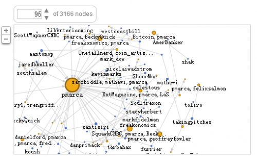 Andreessen也被提到了很多次,这也在意料之中——他被提到了3600多次(包括被其它用户提到)——考虑到他只发布了145条推特,这个数字很庞大。我们通过一个交互式表格(点击这里)展示他创建的庞大的网络。小黄点代表提及Andreessen和其他人的推文,蓝色点代表发表推文的推特账户。Andreessen是一个大黄点,他连接了提到他的人和他提到的人。