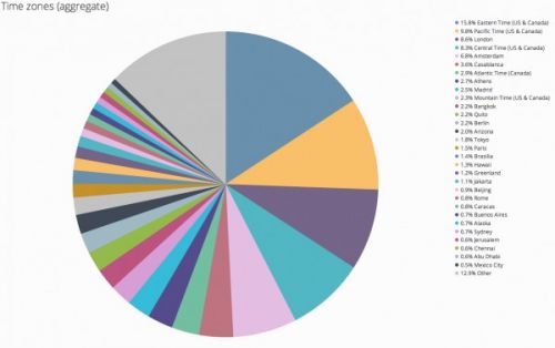 比特币(可能)在哪里流行 下图统计了发布推文数目最多的时区,考虑到垃圾账户的存在和一些账户没有明确的时区或者时区错误,这是一个大概的结果。此外,这个统计是针对单条推文的,不是面向不同时区中的不同推特账户的。例如,ALLThingsBTC账户所发布的15,000条推文中的20%是来自伦敦时区的。