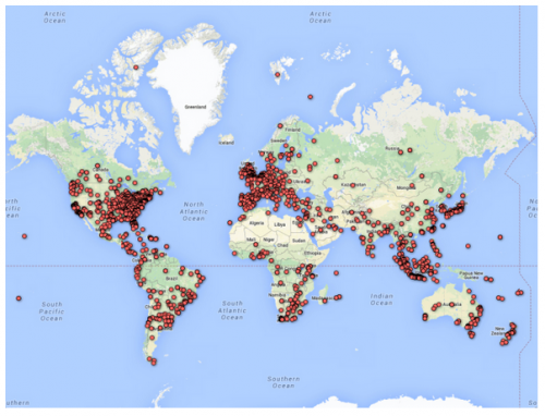 如果你想看这些数据的视觉效果图,下图是使用Google Fusion Tables对小样本用户位置映射得到的效果图。这并不完全精确——Fusion Tables视图将每个事物定位,即使有些没有真正的位置——但它大致描述了全球比特币的现状。