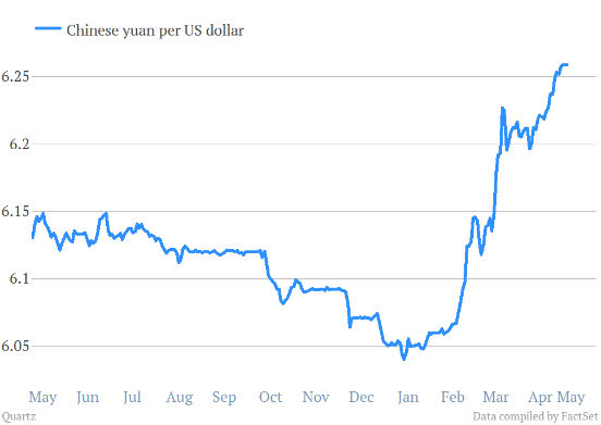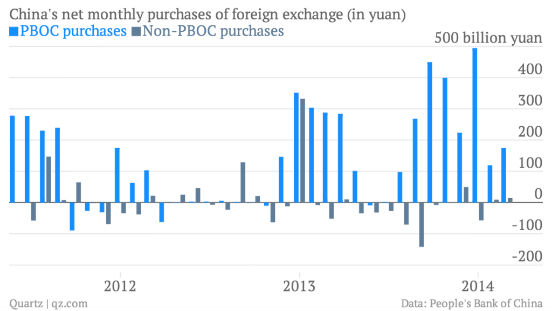 一些投资者将人民币跳水归咎于外汇市场的投机者。但是最新的数据显示,3月中国央行购买了价值280亿的美元,等价于人民币1740亿美元。这个数字相当于当月中国购买美元总额的90%以上。