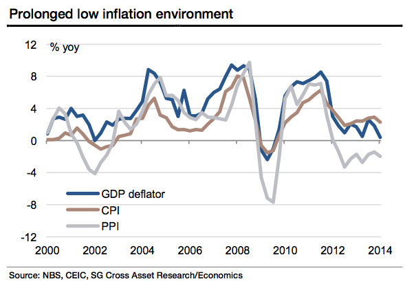 法兴银行中国首席经济学家姚炜表示,物价水平下降通常暗示公司和家庭在偿还债务,但中国并没有发生这种状况。同时,信贷规模的增长速度仍然是GDP增速的两倍,意味着大规模信贷行为仍在继续。按常理来讲,信贷增长所导致的大规模投资应该会流入经济中,从而致使价格上涨,但是,为什么没有呢? 姚炜表示,这可能是因为国营部门仍然在疯狂借贷,但这些钱却投资到了不能够赚钱的项目中去。