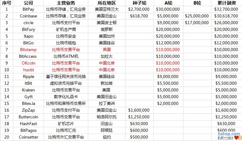其中红色标注部分,Bitstamp只是据传有1000万美元的投资,okcoin和火币也分别有千万美元级别的融资报道,但具体数目和完成日期不详。 从数据统计结果来看: 1)排行榜中近一半在美国,几大平台bitpay,coinbase,circle基本都有在做商家集成支付服务; 2)中国目前的应用主要集中在比特币交易所这块,其他应用还很少,也没有见过有项目公开报道过吸引风投; 3)从排行前20名来看(超过50万美金),囊括芯片生产,矿机生产,支付汇兑,交易所,钱包,比特币安全,ATM机等,比特币产业链已经逐步丰富和完善。 汇总排行榜前20名投资总额,大约有2.54亿美金,除开部分公司在今年之前所获融资,此数据统计基本和上图1相当 |