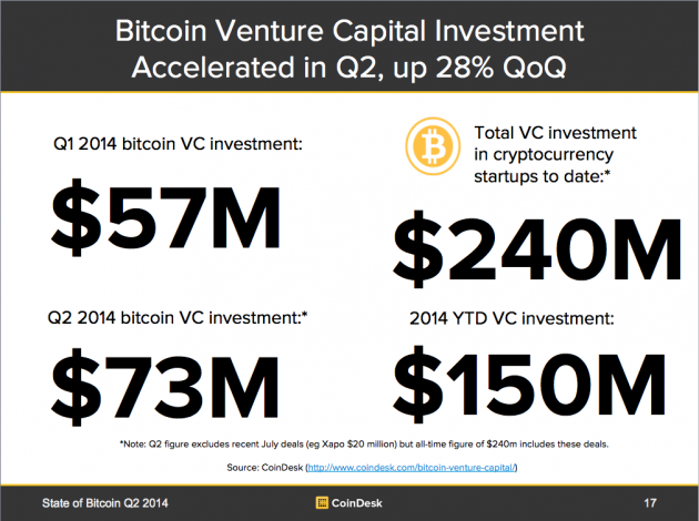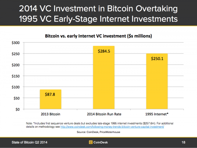 如果我们将第三季度初的风险投资也计算进去(特别是Xapo最近拿到的2000万美元),从2012年起,比特币初创公司拿到的投资共为2.4亿美元,而单独计算下2014年初至今,你会发现这个数据为1.5亿美元(占三年总投资金额的63%)。