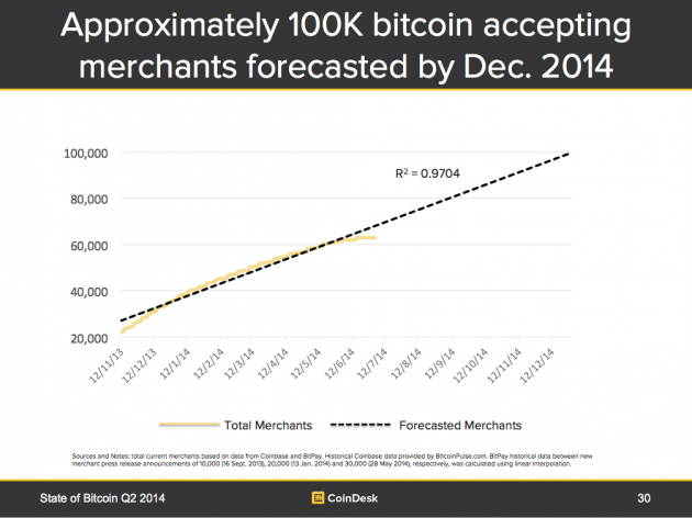 图6:目前接受比特币的商家总数,以及预测2014年年底接受的商家总数