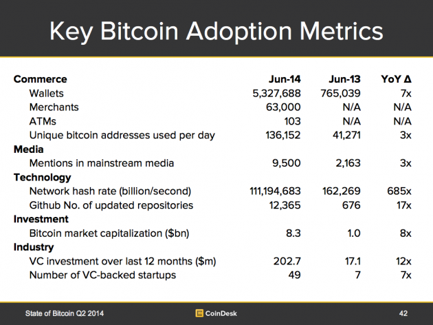 预计2014年将诞生第800万个钱包,以及第10万家比特币商店 我们一直努力扩大比特币数据的数据库,如此我们可以更密切地监测到比特币的进步并做出预测,比如说钱包使用和接受比特币的商户。下面是我们给出的一些主要的比特币指标(图4)。