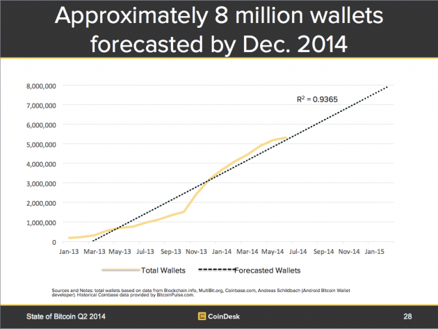 图5:比特币目前的钱包总数并预测2014年年底的钱包总数