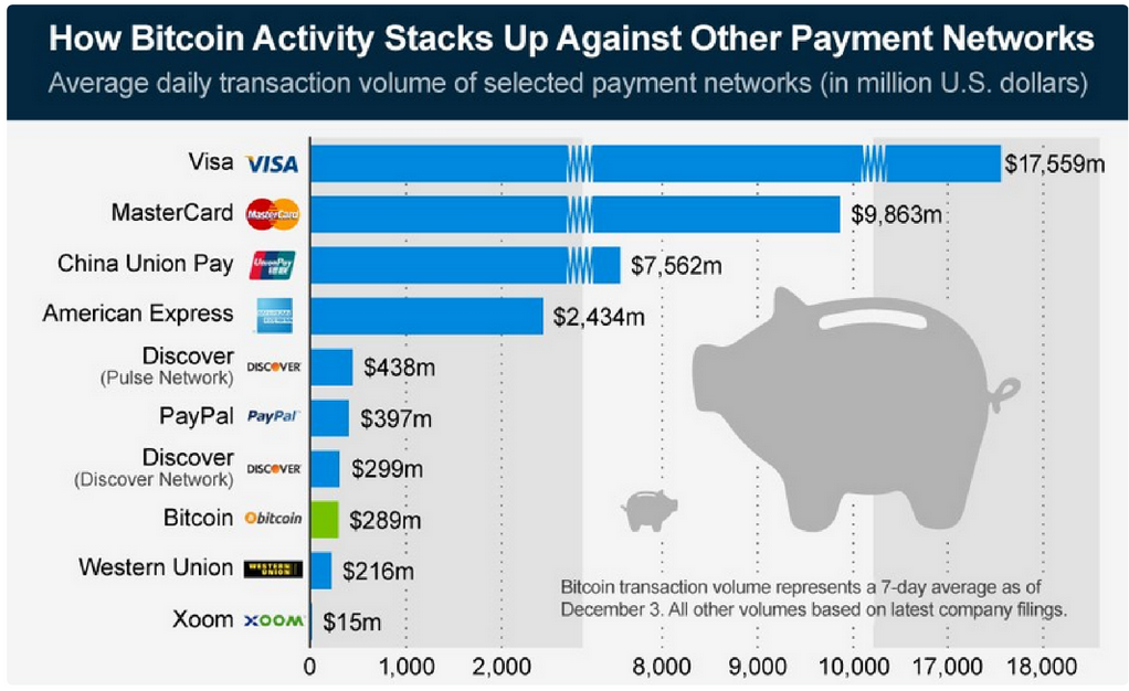 由于比特币今年每日的交易次数在高位徘徊,且平均价格远高于去年,我们可以确定比特币在2014年的交易量会远远甩开西联汇款。