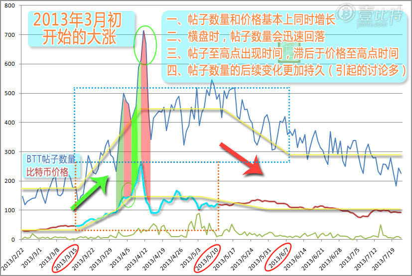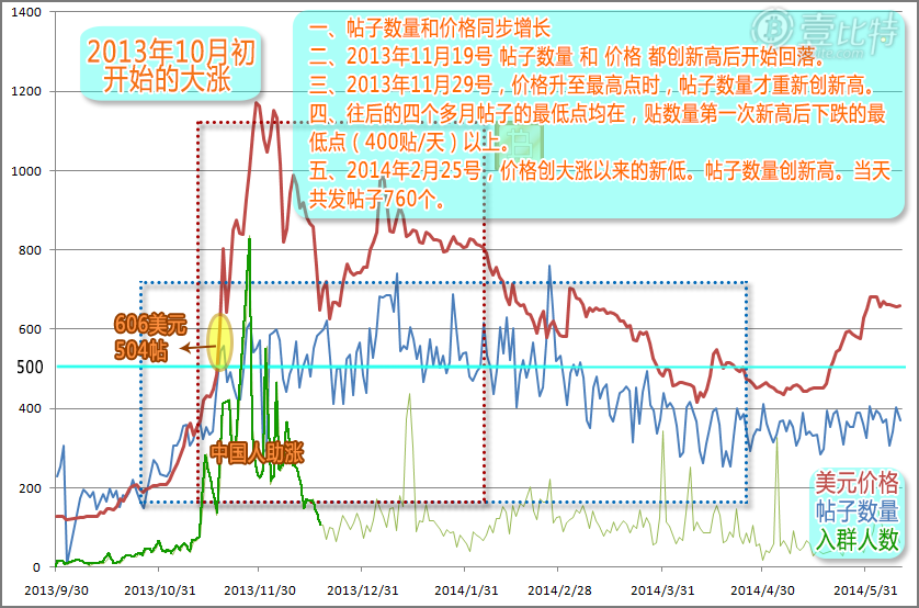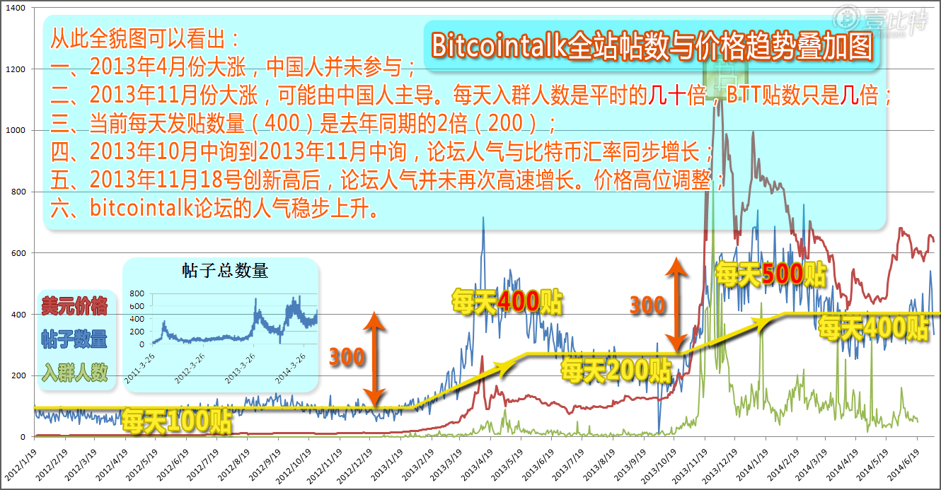 从统计TALK帖子数量上,可以总结出以下内容: 一、 2013年4月份大涨,中国人并未参与;价格差不多涨完后,中国人才大量入场。 二、 2013年11月份大涨,可能由中国人主导。每天入群人数是平时的几十倍,而BTT的贴子数量只是平时的两三倍; 三、 当前每天发贴数量(400)是去年同期的2倍(200); 四、 2013年10月中询到2013年11月中询,论坛人气与比特币汇率同步增长; 五、 2013年11月18号创新高后,论坛人气并未再次高速增长。价格高位调整; 六、 bitcointalk论坛的人气稳步上升,每天发帖数量基本上每年都翻一倍。 七、 论坛发贴数量在4月12号开始恢复人气,发贴数量稳步上升。有望在9月份恢复至2013年底大涨时的数量。