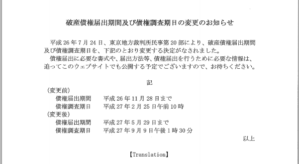 2014年7月24日,东京地区法庭第20分支民事法庭下达了一个决定,变更索赔证据提交截止时间及索赔调查日期,如下文。