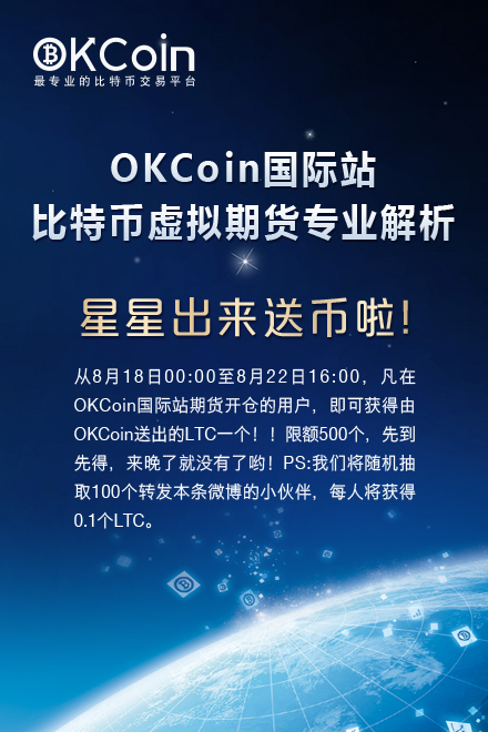 2014年8月18日00:00至2014年8月22日16:00,凡在OKCoin国际站期货开仓的前500位用户,即可获得由OKCoin送出的LTC一个!! PS:我们将随机抽取100个转发本条微博的小伙伴,每人将获得0.1个LTC。