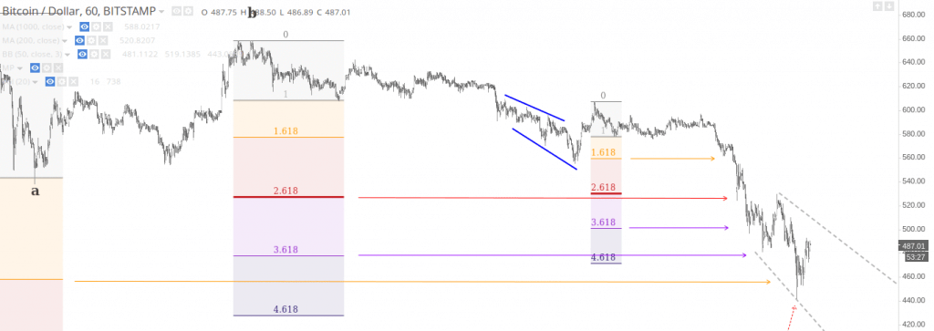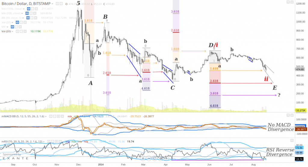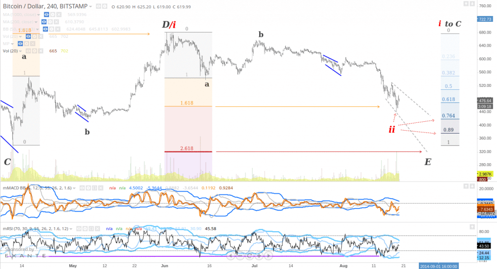 自从六月早期比特币价格涨至680美元后,比特币价格图表《反相比特币价格》表明最近有下降的趋势。这种下降趋势,虽然看似无情,但是与2014年前五个月的下降相比,幅度和波动都相对降低。事实上,当前波下以价格波动和测量修正为特点。最大的问题是,它将在哪里结束,比特币和美元的价格水平即将跌至谷底,比特币图表的下一步走向,为我们提供了进一步的线索。 CCN的这篇文章的研究表明,这是在市场周期里购买比特币的最佳时期。下面的分析将针对从谷底逆转的可能性。读者们在冲动行动之前,应该先阅读一下下面Coinbase Friday的部分文章。 摘要 在艾略特波浪(E波)的背景下现在处于波谷,要么E波从2013年11月出现较大的调整,要么第二波开始回升。作者预期可能出现“牛市陷阱”后,E波在5月首次提出解释,但波数低估后,价格没有变化。 如果现在E波涨停后低于340美元,就可以预期因波的回升,波峰会出现激增。另一方面,如果再出现第二次下降,那么可以预期会在340美元的上方涨停,掀起第三波。 用0.618 Fibonacci(单股函数)扩展了第一波,价格开始扭转。这张图显示了它的进步。 图一