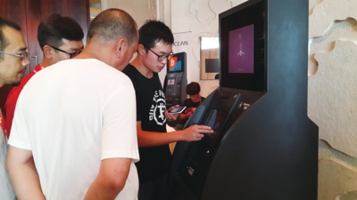 厂家正在展示比特币ATM机的使用。赵超霖/摄