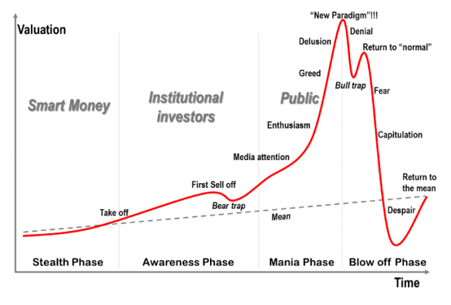 对比两张图,你会发现,比特币价格现在可能处于“恐慌”阶段了。 《金融时报》的Izabella Kaminska称,在这个阶段,我们可以预计比特币末日将临。那些将比特币价格推升至1124.76美元高点的因素,也会同样将比特币价格推向价格底部。 这些影响比特币价格走势的力量包括:当比特币价格上涨的时候,比特币不会被过度产出;同样的,当比特币价格或需求崩溃的时候,比特币的产出也不会收缩。 那么,投资者是怎样着迷这种妄想的喜悦的呢?当然,这是老生常谈的故事,关乎轻浮、非理性繁荣、异想天开,以及相信免费的午餐是真实存在的(如相信苏格兰独立后会采用比特币作为货币)。 在目前美联储收紧政策言论之际,购买比特币也是不理性的,是一种糟糕的资产配置选择。 当然,一些资金充裕的VC和比特币“信徒”仍然会投入更多的钱来捍卫比特币之梦。但是,比特币现在处于指数式暴跌的边缘。还是把资金和时间留给比特币“梦二”开始的时候比较好。 原文来自:http://wallstreetcn.com/node/208477 |
